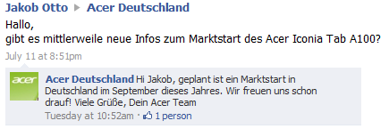 Here is Acer Germany’s reply to a guy on Facebook page:
