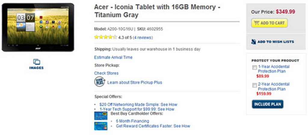 Budget-priced Amazon Kindle Fire 7-incher has really changed the fate of the Tablet competition. At CES 2012 event, Asus has confirmed the most affordable quad-core processor equipped 7-inch Android 4.0 Ice Cream Sandwich OS running tablet just for $249.99. But, it seems Acer isn’t bothering about reducing the price tag of its newly announced Acer Iconia Tab A200 tablet. As announced earlier, Acer Iconia Tab A200 is now available to purchase at Best Buy for $349.99. You will be able to get a 16GB Titanium Gray variant at Best Buy stores. Acer Iconia Tab A200 8GB variant costs $329.99. But, Best Buy has listed the 16GB variant only on its website.