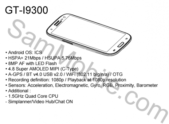 From what we can see in this image, the device looks pretty good and it has got a centre button. BUt, Google has got rid of the menu button. So, the device in the image could be a rough drawing for later elaboration. The leaked service manual has also mentioned the specifications for the Galaxy S III handset. It will have a new Super AMOLED C-Type display measuring 4.8 inches, 8MP primary camera with LED flash, 1080p HD video playback/recording capability, RGB sensor, Electromagnetic sensor, Bluetooth 4.0, Wi-Fi a/b/g/n, HSPA+ 21Mbps capability, 1.5GHz quad-core processor and most probably Android 4.0 ICS OS running the whole show.