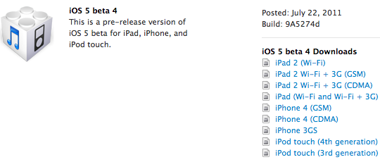 On Friday, Apple has started seeding the iOS 5 beta 4 version for the developers to test on iPhone 4, iPhone 3GS, iPad 2, iPad, and third and fourth-generation iPod touch devices. Along with the latest beta 4 of iOS 5, Apple has also pushed out a new beta of iTunes, and the The new software carries the build number “9A5274d”. Apple has released the beta 3 of iOS 5 exactly two weeks ago. Apple released the first beta on June 6th, the second on Jun 24, and the third on July 11th.