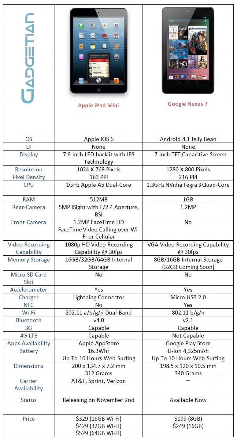 For more information: Apple iPad mini Full Specs | Google Nexus 7 Full Specs
