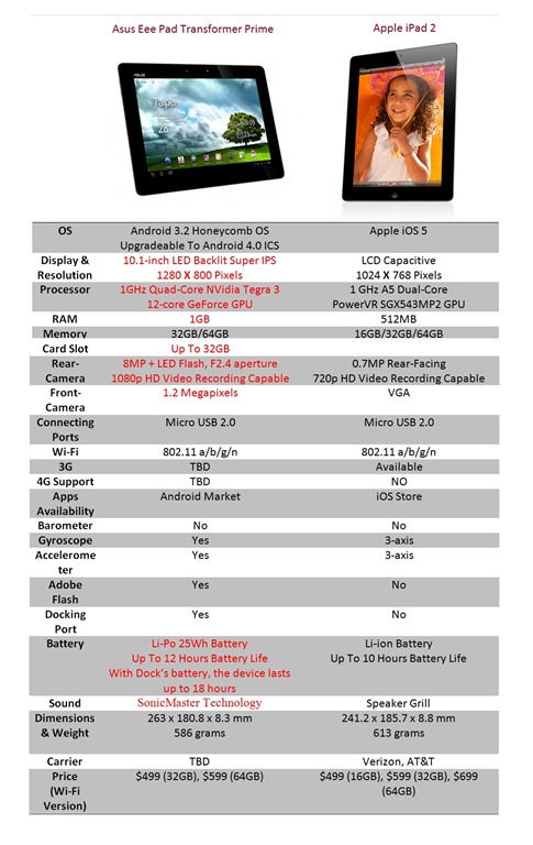 Asus Eee pad transformer Prime Vs. Apple iPad 2: Specs Comparison