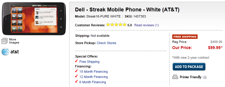 Buy: Best Buy is offering White & Black coloured Dell Streak right now and pricing is same for the both tablets at $99.99.