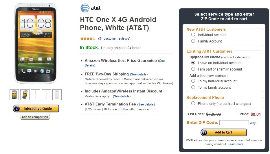 Heads up AT&T customers. We’ve a good news for. If you have been waiting for a greatest price offer on the HTC One X handset, head over to Amazon Wireless website right now to grab it for just a penny on contract agreement with AT&T. Amazon has listed for just $0.01 and the price drop is applicable for both white and gray editions and the current AT&T subscribers can take advantage of this deal. Unfortunately, this deal doesn’t applicable for the new customers. They’ll have to shell out $99.99 for this device.