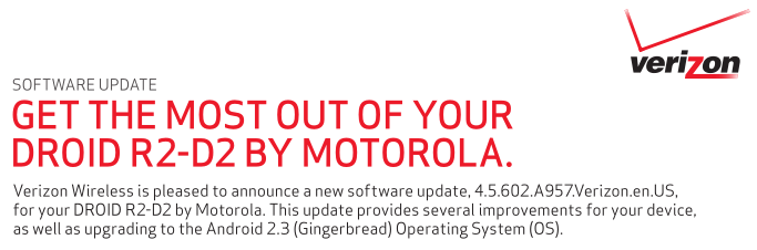 Are you one of the Motorola Droid R2-D2 handsets’ users on Verizon, who have been patiently waiting for the most-awaited Gingerbread update? If so, we’ve got some great news that could make you feel happy. It seems Verizon has started rolling out the Gingerbread update for the Droid R2-D2 handsets, but there is a “Coming Soon” tag on the support page of the R2-D2 software update information on Verizon website. The latest update is bearing the build number 4.05.602.A957.Verizon.en.US and it weighs in at 137 MB. Along with the Android 2.3 Gingerbread flavor, this update will also bring a new Download Manager to manage your downloads, e-mail attachments and apps, a new "Manage Applications" tab to see a running list of open applications and the storage and memory used by each one. The new multi-touch shortcuts will let you punch in numbers and symbols without having to change to the numeric keyboard mode. There will also be improved word selection and copy functionality. You can find the full list of enhancements and fixes included with this new update down below.