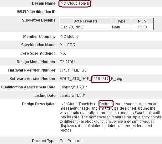 In Bluetooth SIG entry, the device is named as INQ Cloud Touch and it is strictly integrated with “Facebook built into its core” and you can clearly not that software version has a build date of 2010/12/17.