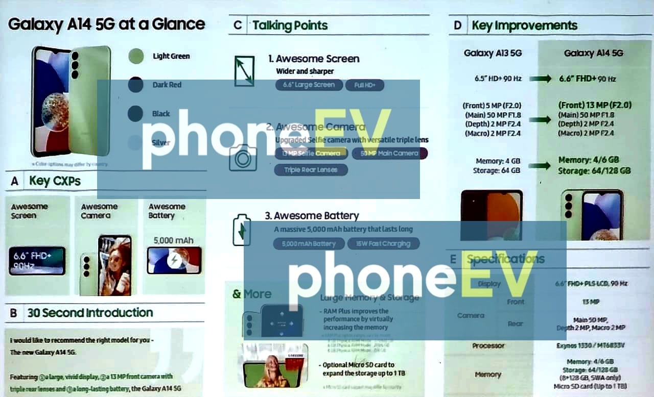 The leaked poster hasn’t revealed the processor details for the India version of the Galaxy A14 5G, but Samsung has kept Exynos 1330 chipset for the global version. The phone will be sold in Light Green, Dark Red, Black, and Silver, as tipped by the promotional poster.