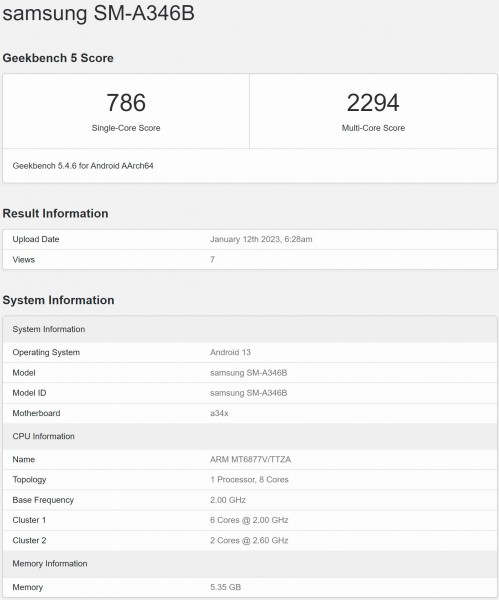 The handset spotted running with Android 13 (undoubtedly with One UI 5.0 on top) and has 6GB of RAM onboard, although there would be another memory option that is yet to be confirmed. It achieved a 786 single-core score and a 2,294 multi-core score in Geekbench 5. We should keep in mind that the device used for benchmarking isn’t a final retail unit, so actual scores will likely differ.