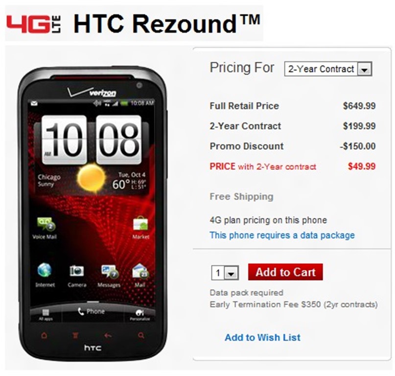 Head over to Verizon Website to grab the 4G LTE capable HTC Rezound for just $49.99 on contract.