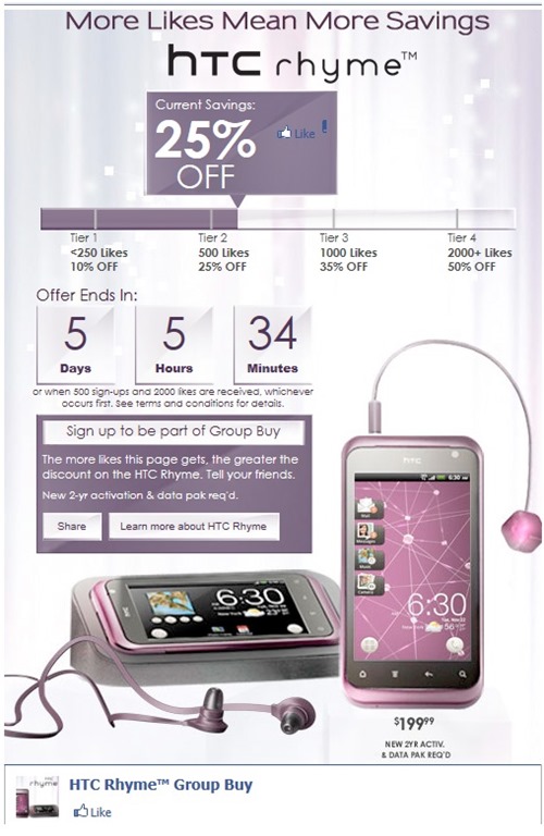 Any of you not pick up an HTC Rhyme handset yet, but have been wanting to for nearly a month now? Now might be good time to grab it. HTC Rhyme has been on sale for $199.99 since September 30th, which is marketed as the ’women-centric’ Android smartphone, but if you are looking for a reasonable discount on this handset, Verizon will give you a chance to offer this handset up to a 50% off discount of the original price tag. Verizon is currently promoting the HTC Rhyme on its official Facebook page and asking the users to “Like” the “HTC Rhyme Group By” page. Yes! the discount offer depends on the range of “Likes” to be received from Facebook users. Currently you can see that the deal is holding 500 Likes and the deal transforms into a 25% discount off the HTC Rhyme. The deal will run for 5 more days till the “Likes” amount reach “2000+”. Then the buyers will be able to buy the handset for half the original price. That means you can grab the HTC Rhyme handset just for $99.99 if the deal can reach 2,000 likes in the next 5 days.