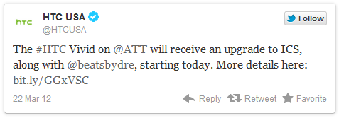 Here’s the tweet from AT&T regrading ICS update for HTC Vivid handset;