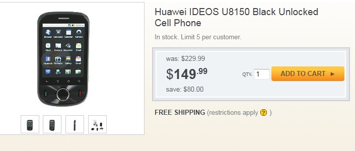 Unlocked version of Huawei IDEOS U8150 is now available through NewEgg retailers, pricing at $149.99 without any contract. Huawei IDEOS U8150 is also known as ‘T-Mobile Comet’ on t-Mobile carriers and it is an Android 2.2 Froyo powered handset with 2.8 TFT touch display, Qualcomm 528MHz chipset, 3.2 Megapixels camera.