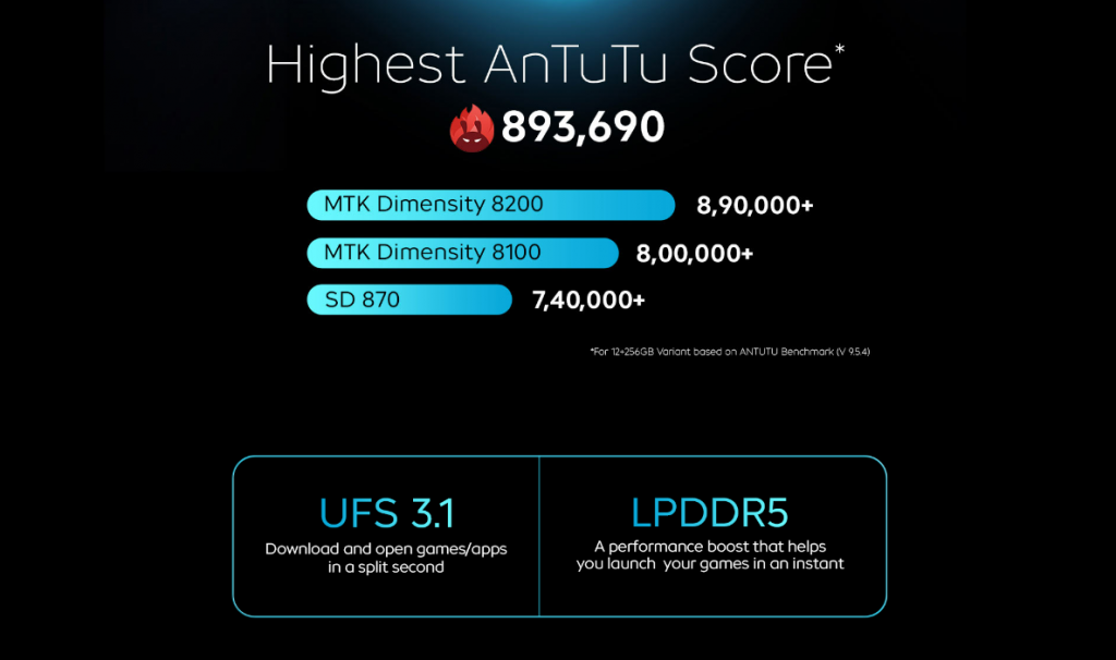While we await for an official launch of the device in India, the iQOO Neo 7 has passed through AnTuTu, revealing key specs in the process, and scored the highest point, surpassing Dimensity 8100, and Snapdragon 870 chipsets powered unspecified handsets. The iQOO Neo 7 scored 893,690 points on AnTuTu, has the Dimensity 8200 2 SoC under the hood with 12GB LPDDR5 RAM and 256GB of UFS 3.1 storage onboard. There could be also lower base model of the device with 8GB + 128GB configuration.