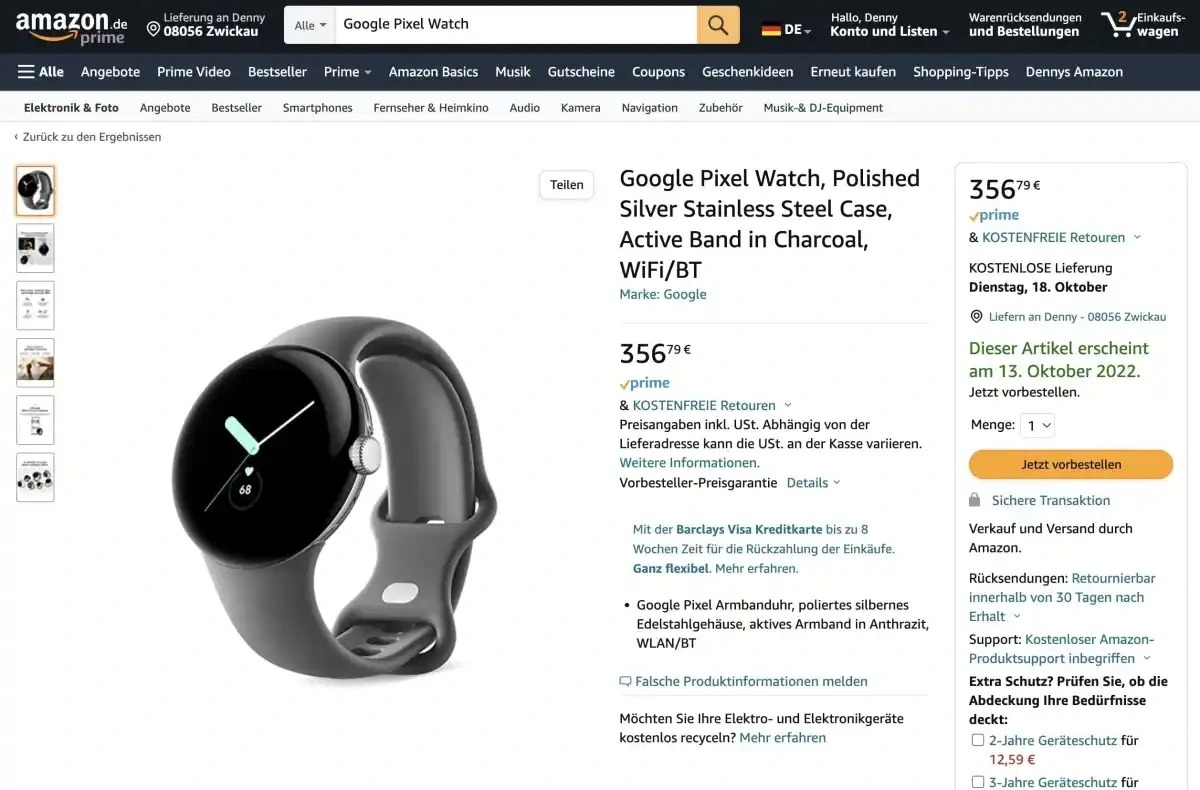 Google is just four days away from officially revealing the Pixel Watch in its full glory. After learning a few hours ago that Google could offer the free Pixel Watch with Pixel 7 Pro pre-order in the UK, a massive leak now reveals a full gallery of official-looking images showing off various bands, watch faces, and give us a better idea of Fitbit’s deep integration with the watch. It has been briefly appeared on amazon.de website and some folks over SmartDroid have reported they were also able to actually put in a pre-booking for the Pixel Watch that was scheduled for delivery on October 13 at a price of approximately €357.