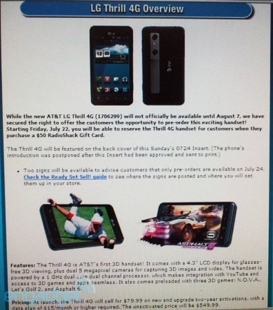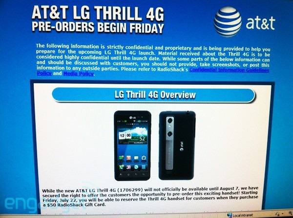 We’ve been hearing many things about the Sprint branded HTC EVO 3D, and the upcoming Motorola Droid Bionic handsets for a while now. But, we should not forget about the second U.S. based 3D-fangled handset. The AT&T customers must be waiting to get their hands on the carrier’s first 3D-fangled device, the LG Thrill 4G, which is also known as LG Optimus 3D through the rest of the world. On June 23rd, AT&T has announced that it is set to launch the LG Thrill 4G handset by this summer. Its almost a month now since the announcement, but the carrier has yet to provide the exact release date and the price of the handset. Folks over Engadget have received two screenshots from RadioShack insiders, revealing some exciting details about the AT&T branded Optimus 3D handset. According to the leaked screenshot, it has been confirmed that you can head over to a local RadioShack stores, and reserve the LG Thrill 4G handset by purchasing a $50 gift card. The handset will be available for general sale starting August 7th.