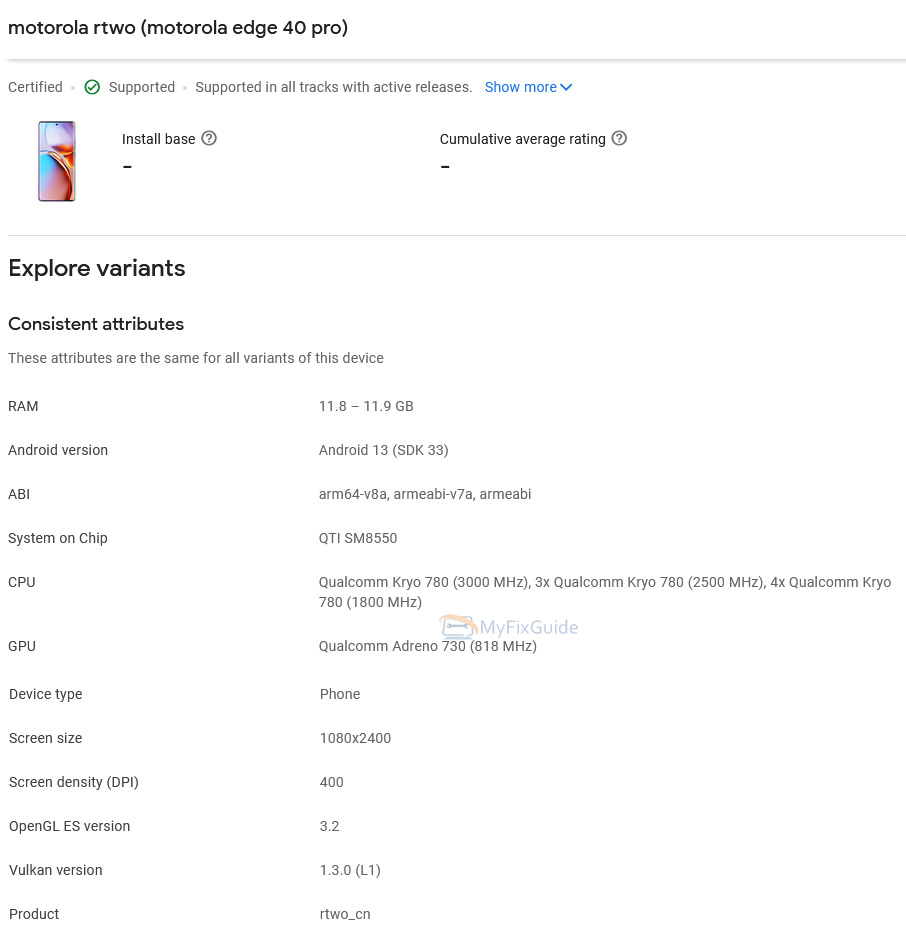According to the listing, the Moto Edge 40 Pro appears to feature the Snapdragon 8 Gen 2 chipset (SM8550) with Qualcomm Adreno 730 GPU clocked at 818MHz. The SD 8 Gen2 chipset is built on the new TSMC’s 4nm architecture with 1x Cortex-X2 Super Core (@3.0GHz), 2x Cortex-A715 and 2x Cortex-A710 Performance Cores (@2.5GHz), and 3x Cortex-A510 Energy-Efficient Core (@1.8GHz).