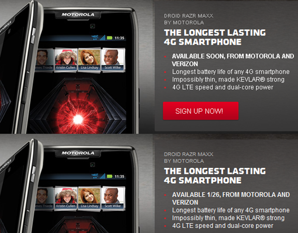 Motorola Droid RAZR MAXX handset has appeared on Motorola’s official website, which states the device will be available on January 26th (see below image). But, the webpage has since been edited, replacing the date with “available soon”. Verizon already announced that the pricing for the Motorola Droid RAZR MAXX would be $299.99 with a 2-year contract and we are waiting for official word about the availability of the handset.
