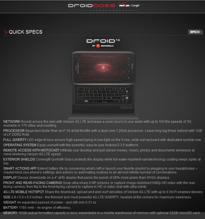 Finally, the Motorola Droid 4 DOES. Verizon is prepping to add the Droid 4 handset for its DROIDDOES website. Everyone is familiar with the DroidDoes website, which is a super awesome website with a cool space video game interface and sounds. A new Droid product has been appeared today on it’s webpage and it is none other than the yet to be launched Motorola Droid 4. Unfortunately, the Droid 4 handset has been pulled from the DroidDoes website. But, we’ve a screenshot of the Droid 4 handset featuring on DroidDoes website. The list of Droid devices on the DroidDoes website now includes the Motorola DROID Xyboard, Droid RAZR, Droid Bionic, Droid 3, Droid X2, DROID Incredible 2 and the Samsung DROID Charge.