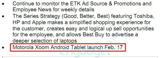 Wow..we are almost nearing for the launch of Motorola XOOM. Folks over Engadget have managed to get a snap shot, which is suggesting that Motorola XOOM will be releasing on February 17th next month at Best Buy stores. Stock should be reached Best Buy on 16th of February. It is being heard that Honeycomb tablet Xoom might get a price tag of $799.99 according to a leaked memo of Verizon.