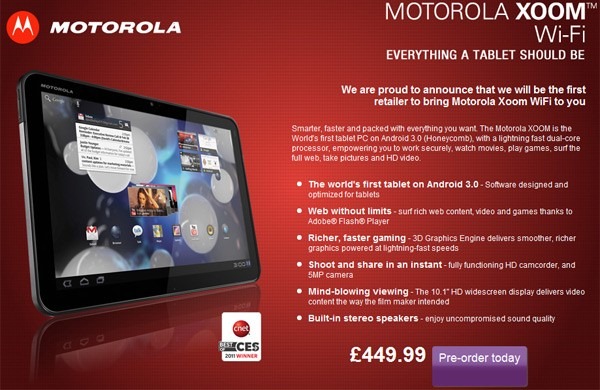 Motorola Xoom 3G version now going on sale in the U.S. for a whopping price of $800 without any annual contract. The upcoming Wi-Fi only version of Xoom will be releasing soon. Here we’ve the pricing information of the Motorola Xoom Wi-Fi only version. Pre-order availability page for the Wi-Fi only Xoom has just popped up on the UK based PC World’s website. According to the PC World, it would cost you £450 ($730). This pricing is very sensible for highly spec’d Xoom. At present, the pre-order page has been pulled and UK consumers can not place an order for this highly-anticipated Xoom.
