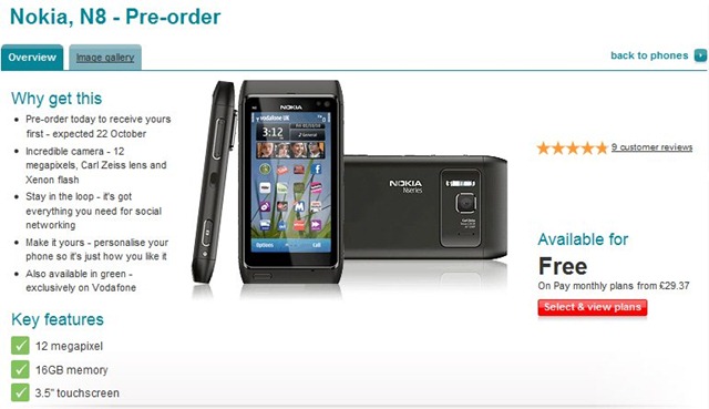 Vodafone is offering Nokia N8 for an attracting price of Free on plans starting at £29.37 (approx $46) per month. Pre-orders will be expected to reach the customers on 22nd October, 2010.