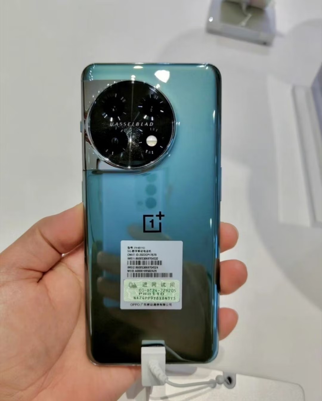 It’s worth mentioning that these images are probably the real-life images of the OnePlus 11 kept at a OnePlus store or any Oppo retail store in China. We’re looking at a retail display unit which was plugged in, locked down, which is ready for viewing. They give us a good look at the design of this device in both Green and Black colors with matte finish. The OnePlus 11 has already appeared in high resolution renders and most of its exclusive features, and full specifications have also been leaked. Well, this is the first time that the OnePlus 11 has appeared in such a crucial leak. The device shown in the real life images carries the model number PHB110.