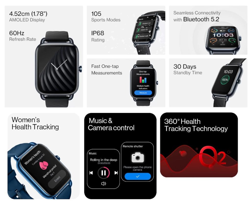 The Nord Watch has sweat permeable and breathable material. OnePlus claims that it has passed 168 hours of burn-in testing and its buttons that have been tried over 200,000 times. It comes with IP68 water protection. It has a good amount of health and fitness features – you can pair up the Nord Watch with the OnePlus N Health app to access health tracking and monitoring features such as 4-hour heart rate, blood oxygen level5, and stress level. Girls/women can check their menstrual cycle tracking on this watch. It has more than 100 watch faces which are accessible through N Health app. It supports 105 Sports Modes including indoor and outdoor walking, and running as well as yoga, cricket, and more.
