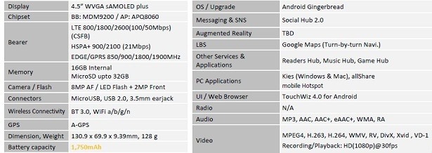 According to the memo, Samsung Celox will feature a 4.5” Super AMOLED Plus WVGA touchscreen display, an 8 megapixel LED flash equipped rear-facing camera, 2 megapixel front-facing camera, a Qualcomm Snapdragon APQ8060 processor, 16 gigs of internal memory, a microSD card  slot, microUSB 2.0, Bluetooth 3.0, Wi-Fi 802.11 b/g/n, Social Hub 2.0, TouchWiz 4.0, and a 1750mAh battery.