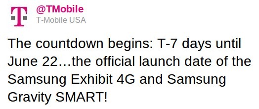 Here is the T-Mobile tweet confirming the release date of Samsung Exhibit 4G and Gravity Smart: