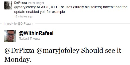 Rafael Rivera of Chevron WP7, Windows hacker and known as Microsoft insider has confirmed about this particular rumor on Twitter. This rumor makes sense as he only first leaked the information about the WP7 handset HTC 7 Pro will be releasing as HTC Arrive for Sprint customers. Here what he tweeted about the NoDo update for Focus:
