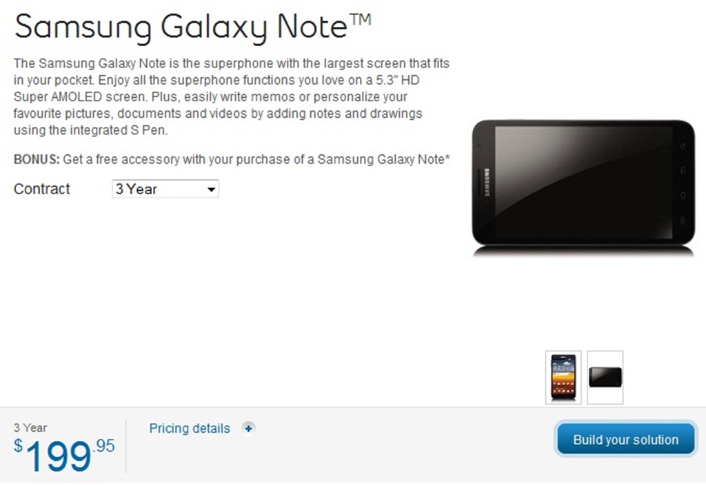 You can head over to either Bell or Telus websites to buy the Samsung Galaxy Note for $199.99 on a 3-year contract with the carrier.