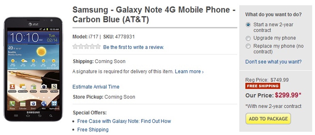 Head over to AT&T Stores and Best Buy Stores (hit the links) for purchase the Samsung Galaxy Note for $299.99 and you’ll have require to subscribe a 2-year contract agreement with the carrier. You can have it for $649.99 as a full retail price tag at AT&T stores without any contract.