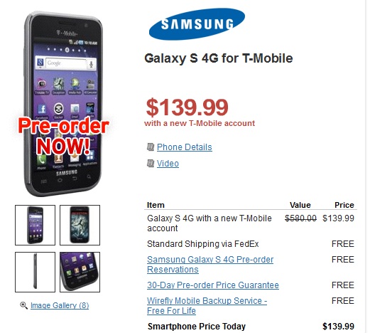 Wirefly has started offerig the pre-orders on the Samsung Galaxy S 4G handset right now and it will cost you $139.99, by signing a two-year contract, that is 10 bucks less than what it costs if you buy it directly from T-Mobile, RadioShack. Walmart will be pricing $148.88 with 2-year contract on the Samsung Galaxy S 4G.