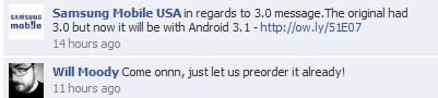 In the comment section of Samsung Mobile USA’s Facebook page, a spokesperson of Samsung Mobile has confirmed that “the original had 3.0 but now it will [be launching] with Android 3.1.”  and Samsung’s official website also updated the webpage of Galaxy Tab 10.1 as Android 3.1 Honeycomb.