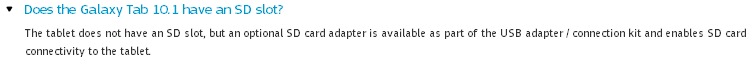 Samsung Galaxy Tab 10.1 isn’t having the Micro-SD card slot for memory expansion, but Samsung has assured that users can purchase an optional SD card adapter is available “as part of the USB adapter / connection kit and enables SD card connectivity to the tablet.”