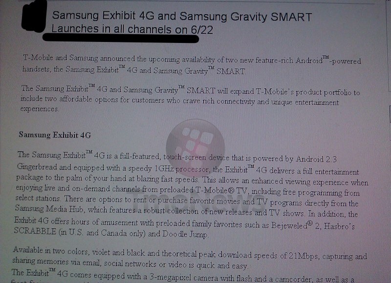 Here is the leaked memo, revealing the release date of Samsung Exhibit 4G, and Gravity Smart handsets: