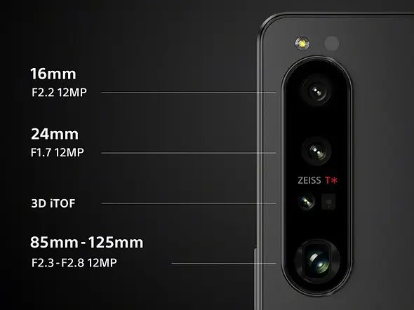 If you compare the camera island to the Xperia 1 IV’s (pictured above), you can observe that the ToF camera and the RGB IR sensor are disappeared. The slightly protruding camera island of the Xperia 1 V has three cameras, an LED flash, a microphone, and ZEISS branding. The LED flash has moved into the island in the Xperia 1 V, placed above the second camera module, whereas it was outside the island, above it, in the predecessor model.
