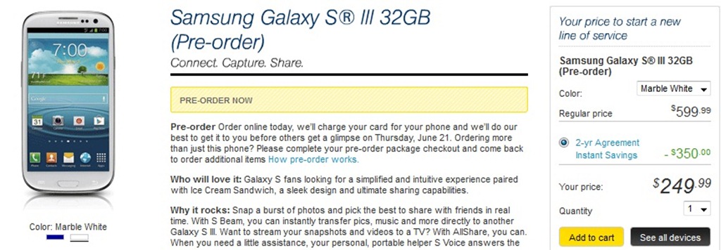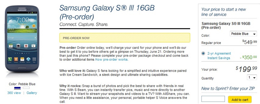 Sprint’s Galaxy S III Up For Pre-Order Now For $199 (16GB), $249 (32GB)