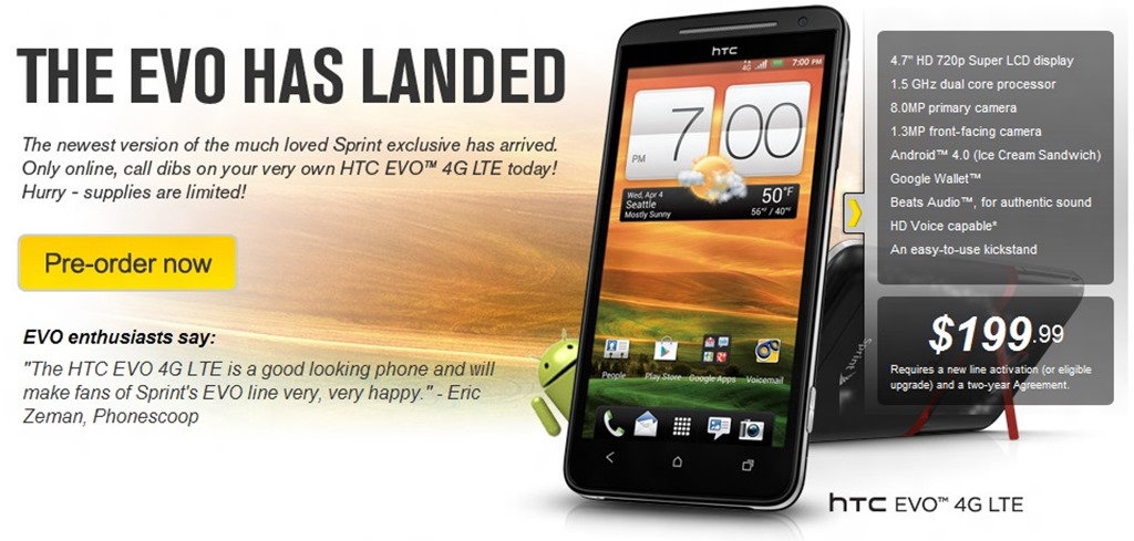 The awesome HTC EVO 4G LTE handset checks in at $199.99 on contract from Sprint, or you can pre-order it for just $149.99 over at Wirefly website (hit the link). The full off-contract price is also reasonable at $549.99.