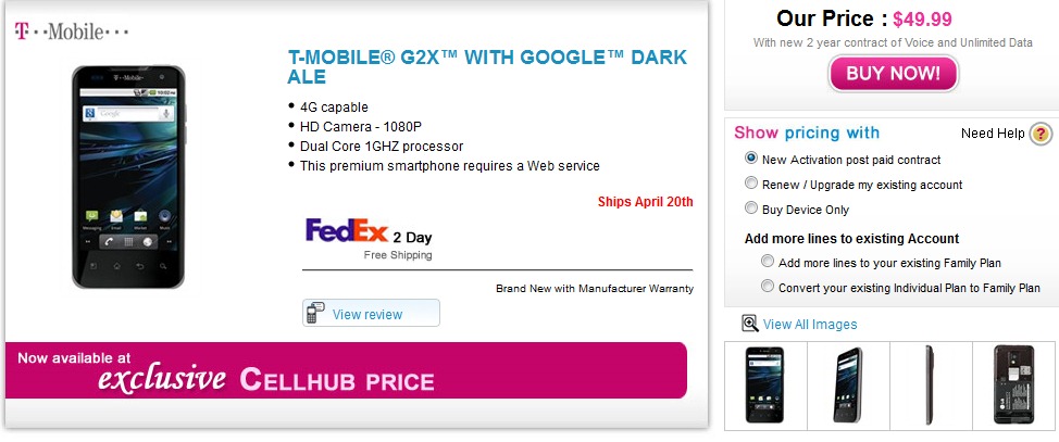 You can grab by ordering it here at Cellhub Stores (hit the link) for $49.99 with a new 2-year T-Mobile contract, including the 2 days FedEx free shipping. The handset ships to you on April 20th.