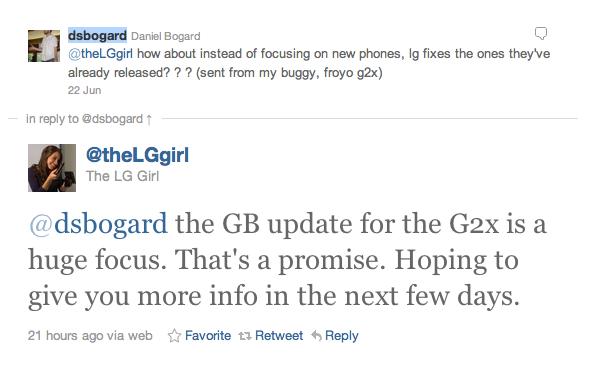 T-Mobile branded LG-made G2X smartphone is currently running on the out-dated Android 2.2 Froyo OS instead of Gingerbread, and T-Mobile users are already getting frustrated with some issues including reboot issues. Last month, T-Mobile has confirmed that it will roll out a software update aimed at delivering performance enhancements, as well as the bug fixes to fix those issues, and the manufacturer has also confirmed that the Android 2.3.4 Gingerbread upgrade will be deployed this summer. T-mobile customers are no need to wait any longer, as the LG Girl has confirmed that the Gingerbread update is still a huge focus for LG and she has also promised that she will give out more details in the next few days.