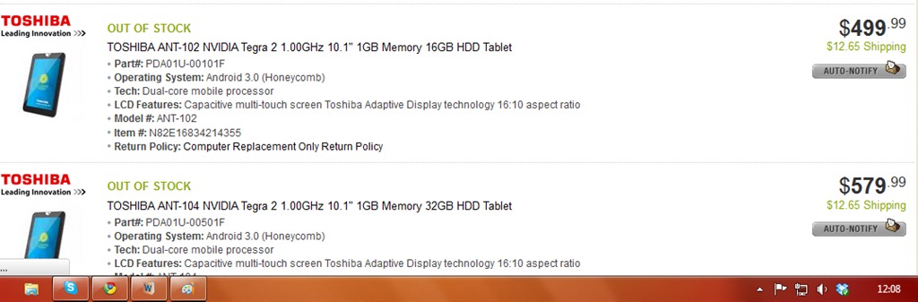 Here is the listing of the Toshiba Honeycomb tablet dubbed as ANT on the Newegg website: