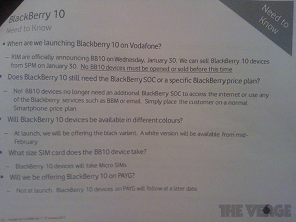 According to an internal Vodafone UK document, the carrier will start selling the Blackberry Z10 on tomorrow, January 30, from 5 PM onwards. The doc also mentioned users can use regular data plans on Z10 to access BBM or internet services. The device will be made available both in black and white version. The white Z10 edition will go on sale in mid-February.