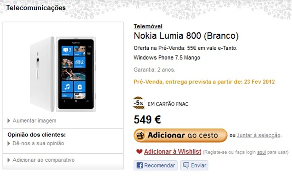 You can pre-order the White Nokia Lumia 800 at Fnac.pt Website for €549. The retailer mentioned on the webpage that the estimated shipping date is February 23rd.