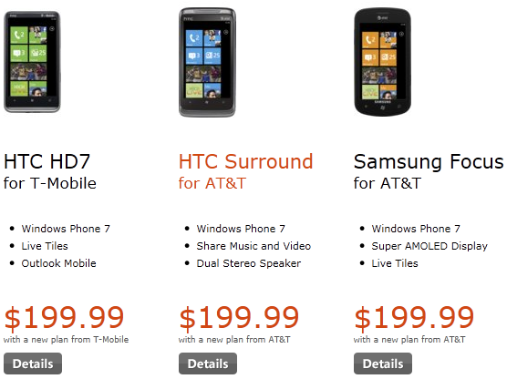 Finally, the most awaited Windows Phone 7 handsets have reached US today and available to purchase for customers. Microsoft just rolls out HTC Surround, Samsung Focus & HTC HD7(T-Mobile) handsets to its online stores and other US retailers.